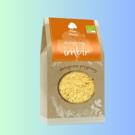 Imbir mielony ekologiczny Dary Natury to produkt pochodzenia roślinnego, w 100% naturalny i certyfikowany jako BIO. Charakteryzuje się wyrazistym aromatem i smakiem korzennym, wspierając trawienie oraz naturalną odporność organizmu. Idealny do stosowania w kuchni, jako przyprawa do potraw, herbat i napojów, nadając im charakterystyczny, pikantny smak.