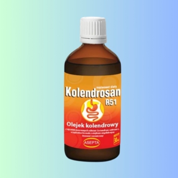 Asepta Kolendrosan R51 to suplement diety w postaci olejku, zawierający naturalny ekstrakt z nasion kolendry (Coriandrum sativum). Preparat wspomaga prawidłowe trawienie, funkcjonowanie układu pokarmowego oraz wspiera metabolizm organizmu. Zalecane stosowanie: 5–10 kropli 1–2 razy dziennie podczas posiłku. Produkt przeznaczony dla osób dorosłych, nie może być stosowany jako zamiennik zróżnicowanej diety. Przechowywać w suchym miejscu, w temperaturze pokojowej, w zamkniętym opakowaniu, niedostępnym dla dzieci.