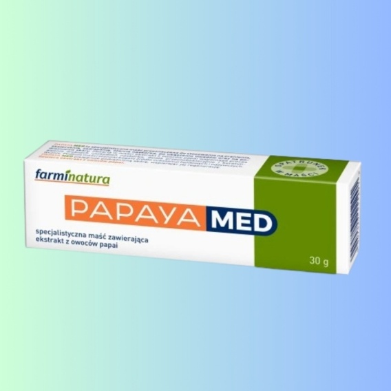 PapayaMed maść 30 g (Farmina) to specjalistyczna maść przeznaczona do stosowania na zranienia, skaleczenia, zadrapania, otarcia naskórka, ukąszenia owadów oraz podrażnienia skóry. Zawiera ekstrakt z owoców papai (Carica papaya), który wspiera regenerację skóry dzięki właściwościom keratolitycznym i przeciwbakteryjnym. Formuła bazuje na lipidowym podłożu: triglicerydach kaprylowo-kaprynowych, oleju rzepakowym, maśle kakaowym, lanolinie, izopropylomirystynacie i wosku pszczelim, co wspiera odżywienie i regenerację skóry. Skład uzupełnia witamina E (octan tokoferylu) — naturalny przeciwutleniacz. Zalecane stosowanie: nanieść cienką warstwę maści na oczyszczoną i suchą skórę, stosować według potrzeb. Nie stosować przy nadwrażliwości na składniki. Przechowywać w temperaturze poniżej 25 °C, w miejscu niedostępnym dla dzieci.
